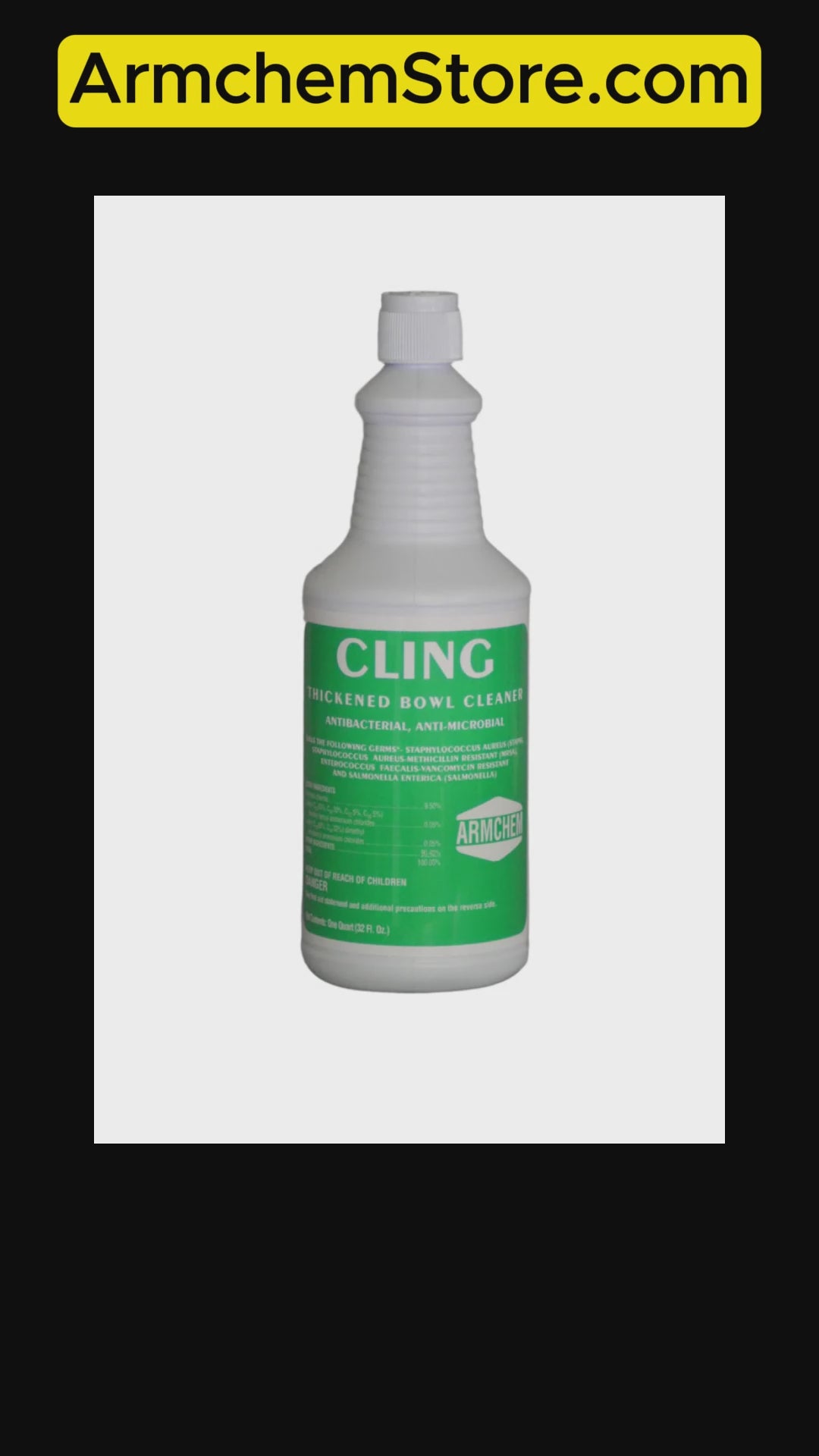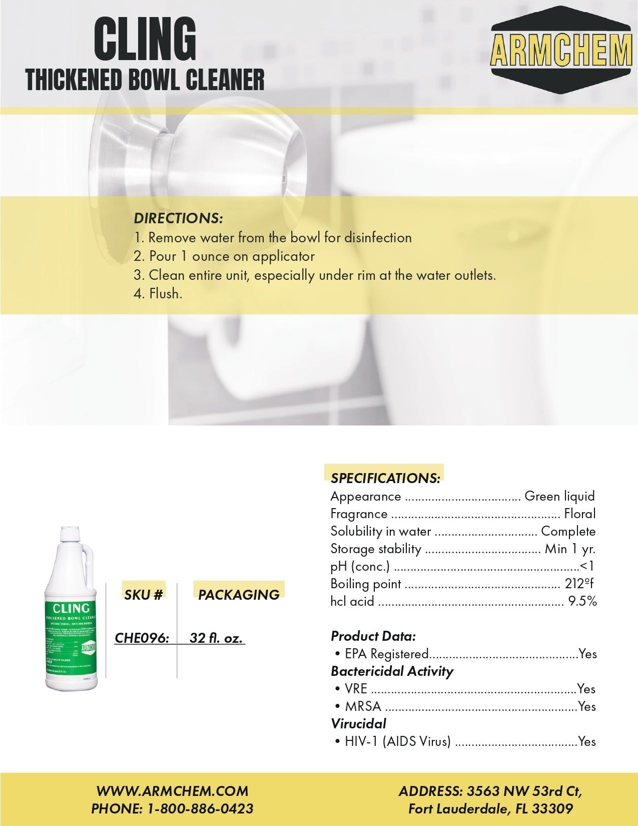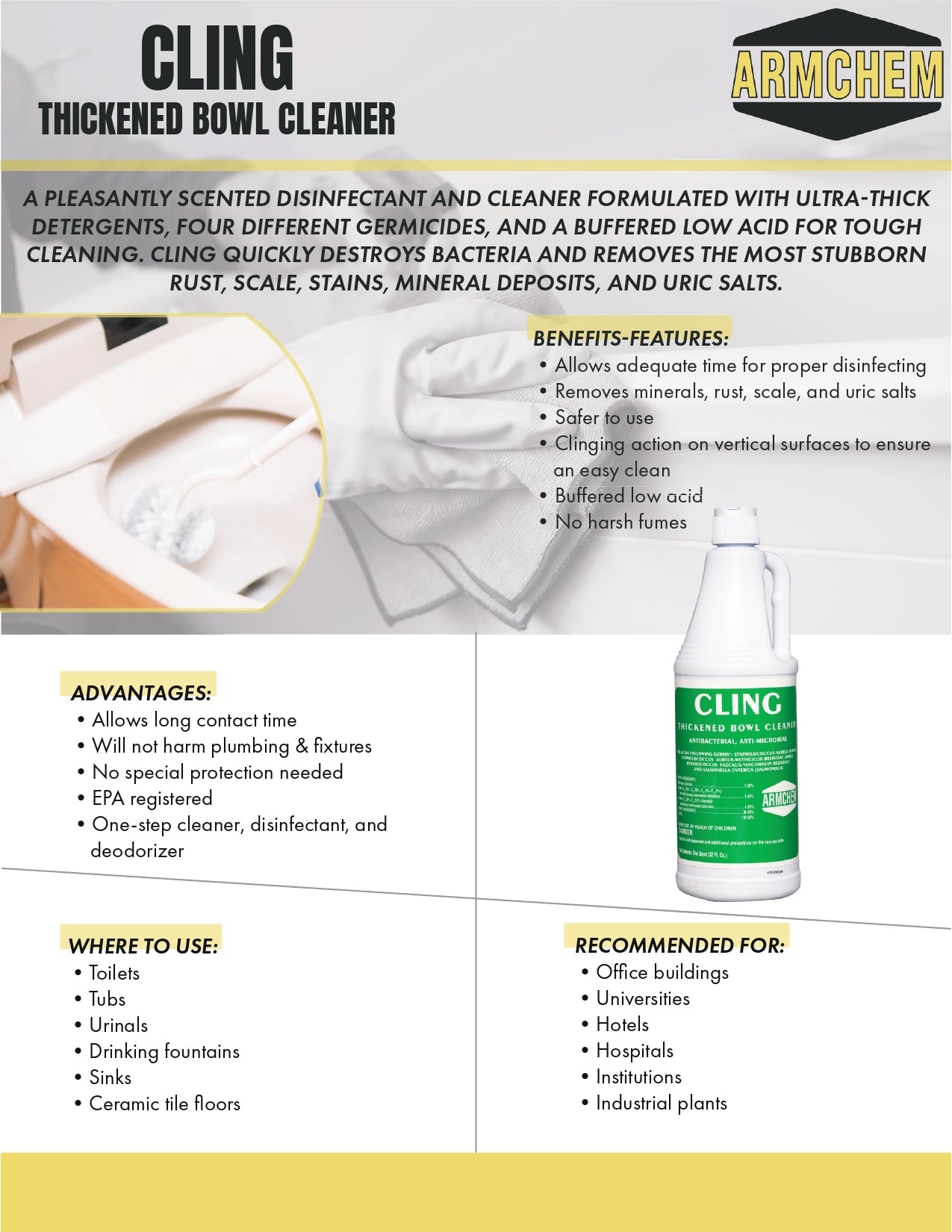 Description: Cling is a pleasantly scented disinfectant and cleaner, formulated with ultra-thick detergents, four different germicides, and a buffered low acid for tough cleaning. It quickly destroys bacteria and removes stubborn rust, scale, stains, mineral deposits, and uric salts.