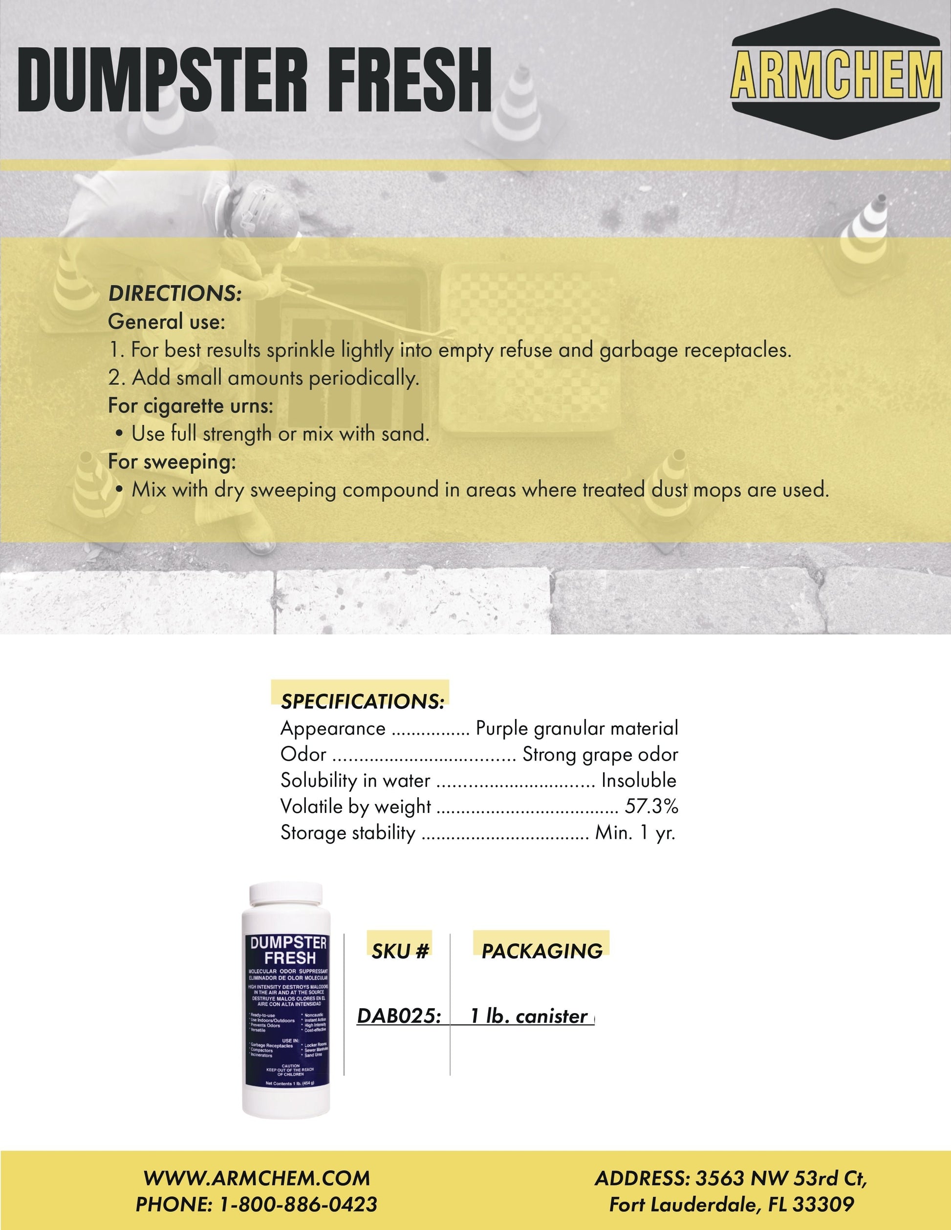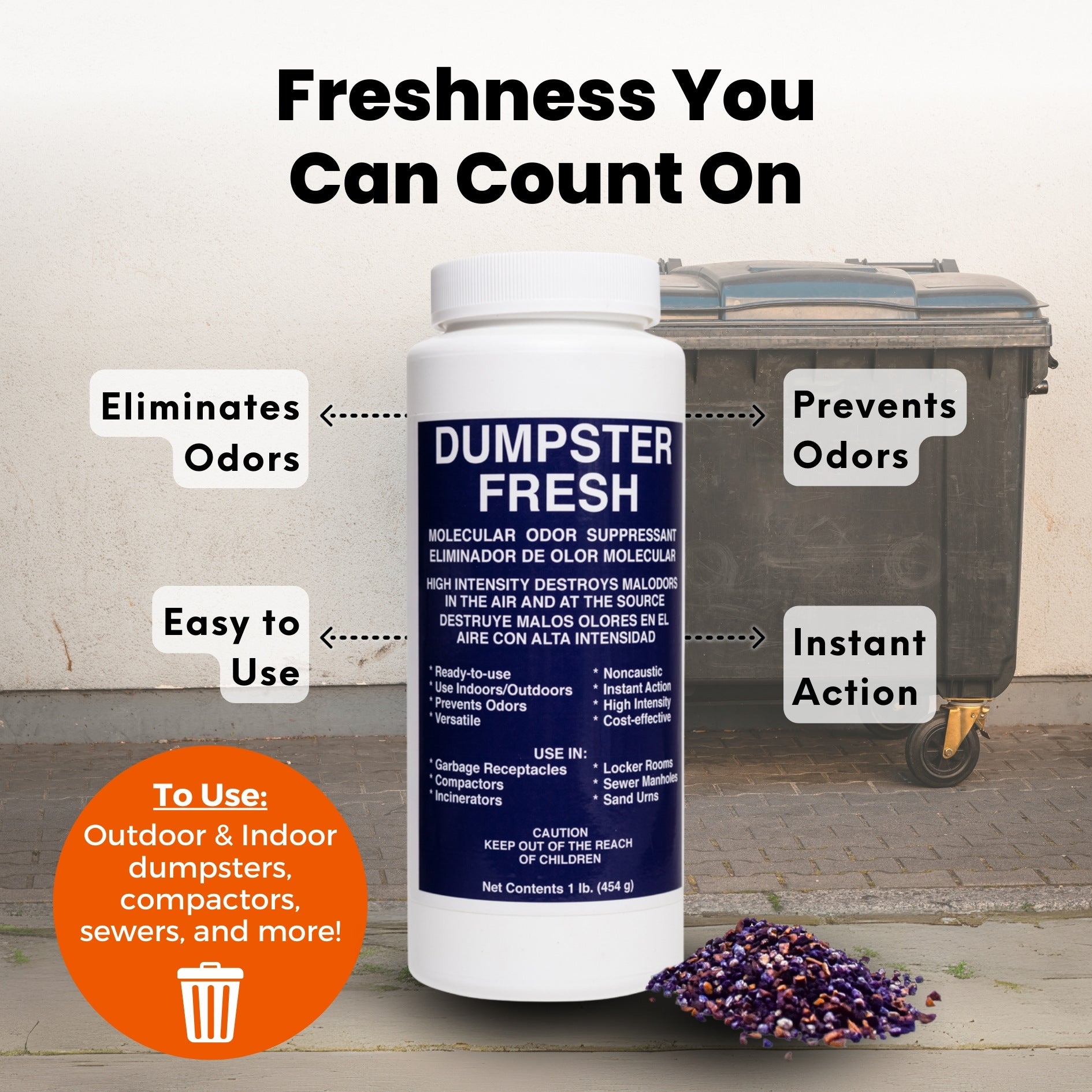 Tired of battling foul odors? Dumpster Fresh Granules are your ultimate solution. This innovative, granular formula attacks odors at the source, instantly neutralizing and absorbing even the most stubborn smells. Perfect for dumpsters, trash cans, compactors, locker rooms, and any enclosed space prone to odors.