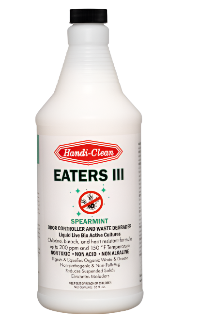 EATERS III SPEARMINT – your ultimate Odor Controller & Waste Degrader. This stable, liquid suspension of spores and vegetative microorganisms is capable of digesting complex proteins, starches, fats, cellulose, and vegetable gums.