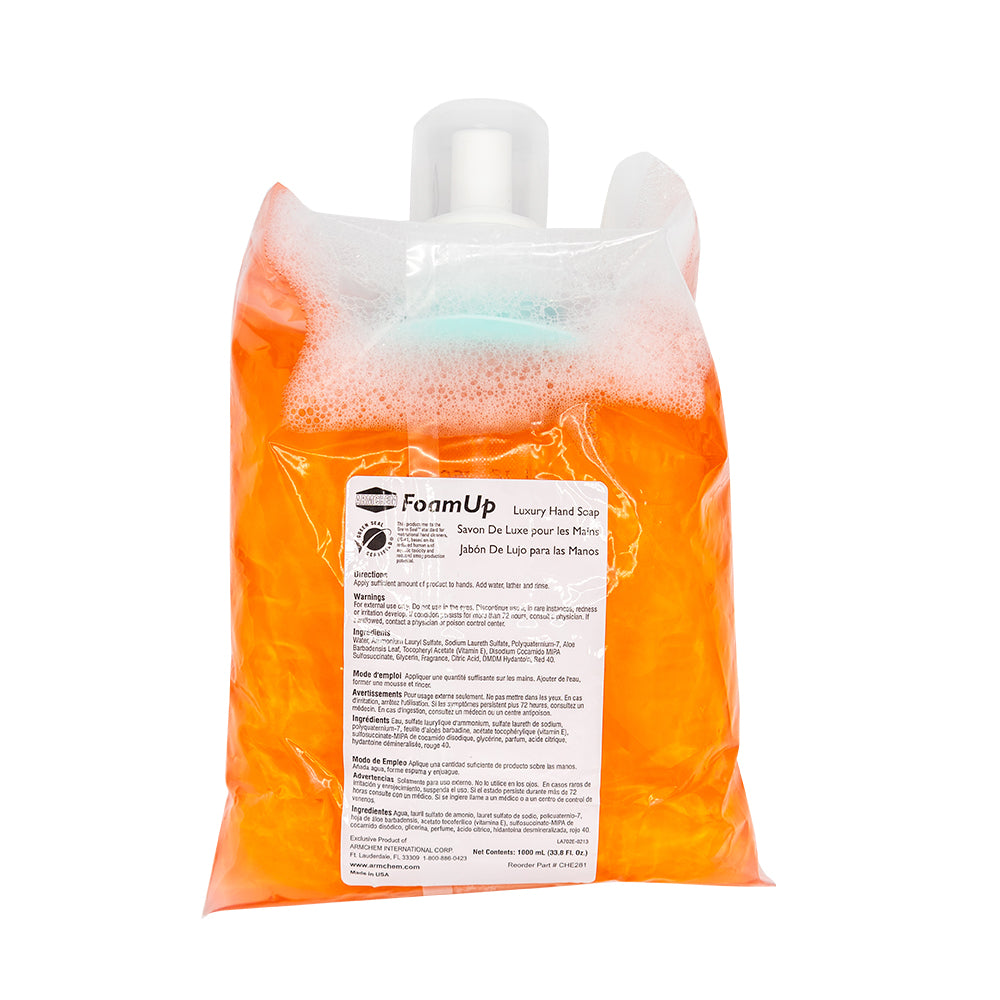 Experience the ultimate in hand cleaning with FOAM UP Luxury Hand Soap. Perfect for all general-purpose hand washing, this soap features a delightful tropical fragrance and special emollients that help soften and nourish your skin. Ideal for light to medium soil removal, it ensures your hands feel clean and refreshed. Available in a convenient pack of 6 x 1000ml bottles. Compatible with dispensers CHE282 and CHE283.