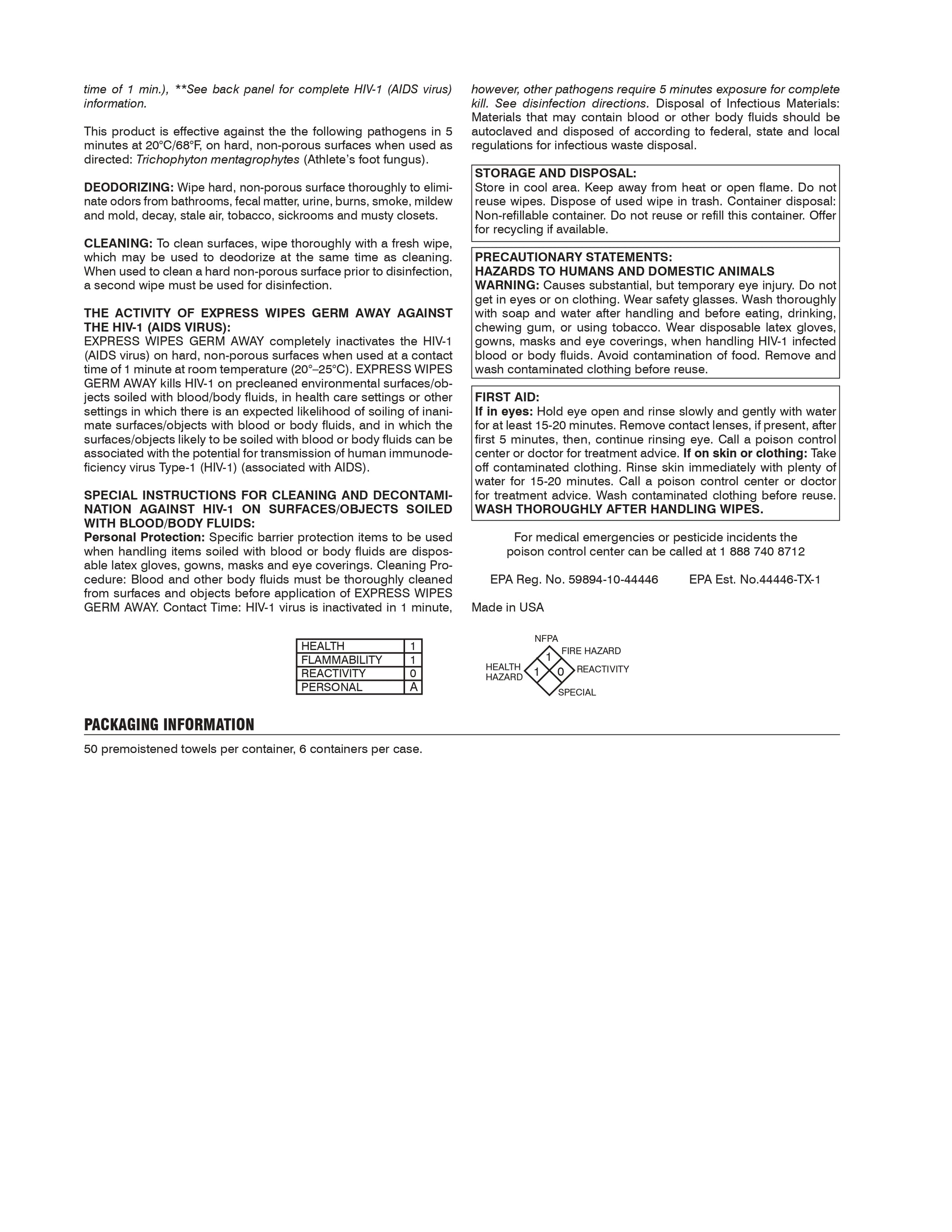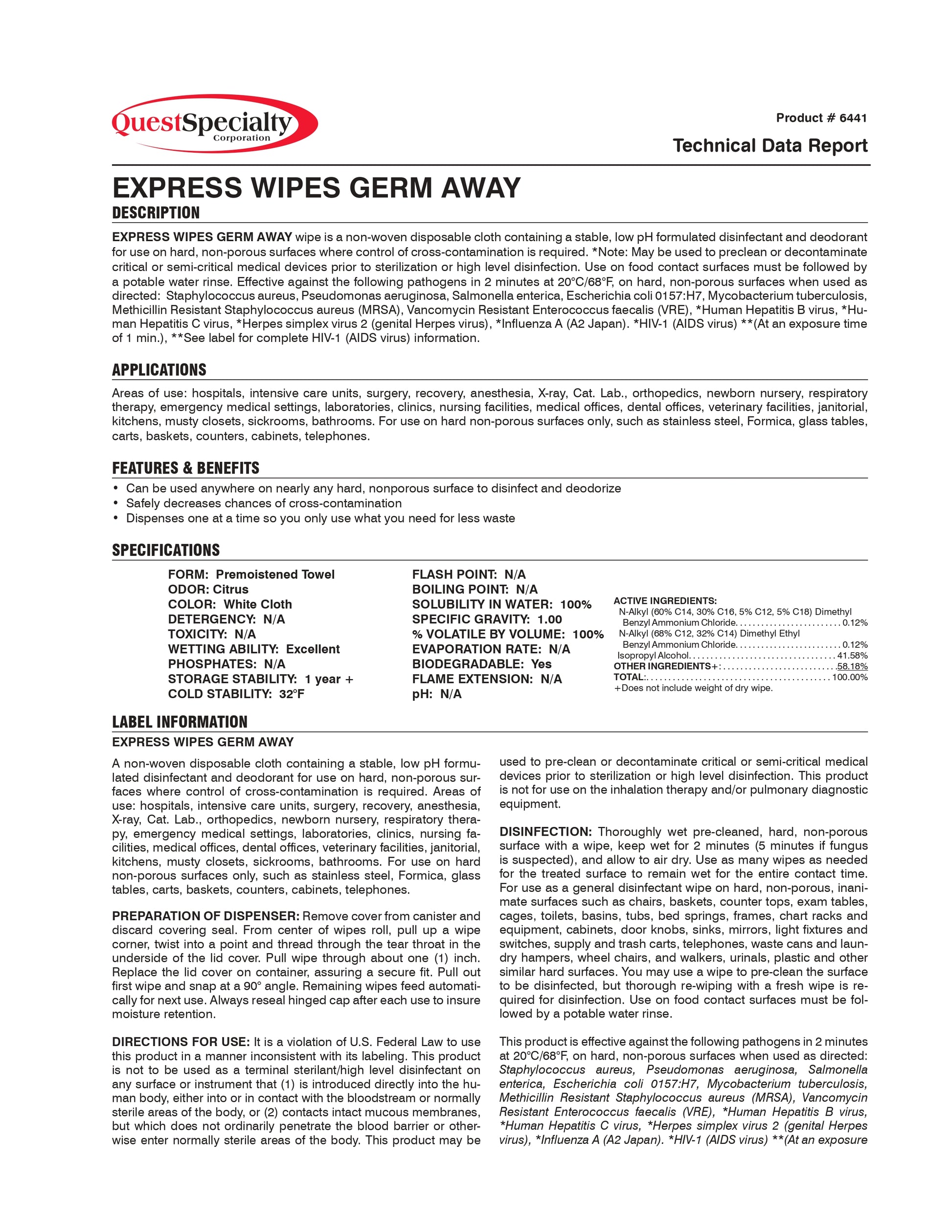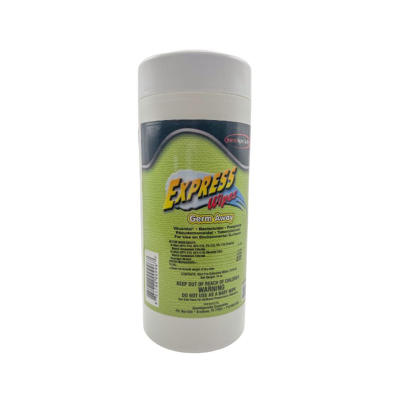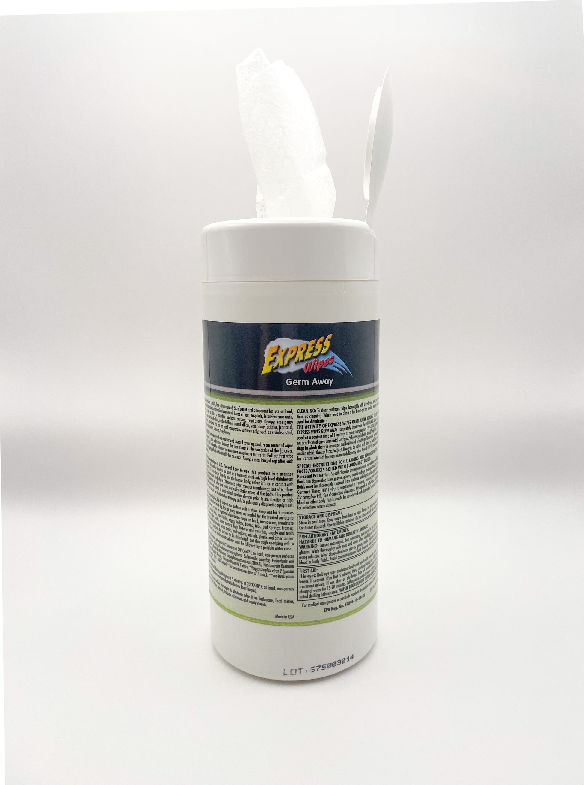 EXPRESS WIPES GERM AWAY wipes are pre-moistened, disposable cloths designed to disinfect and deodorize hard, non-porous surfaces. They are effective against a wide range of pathogens, including: