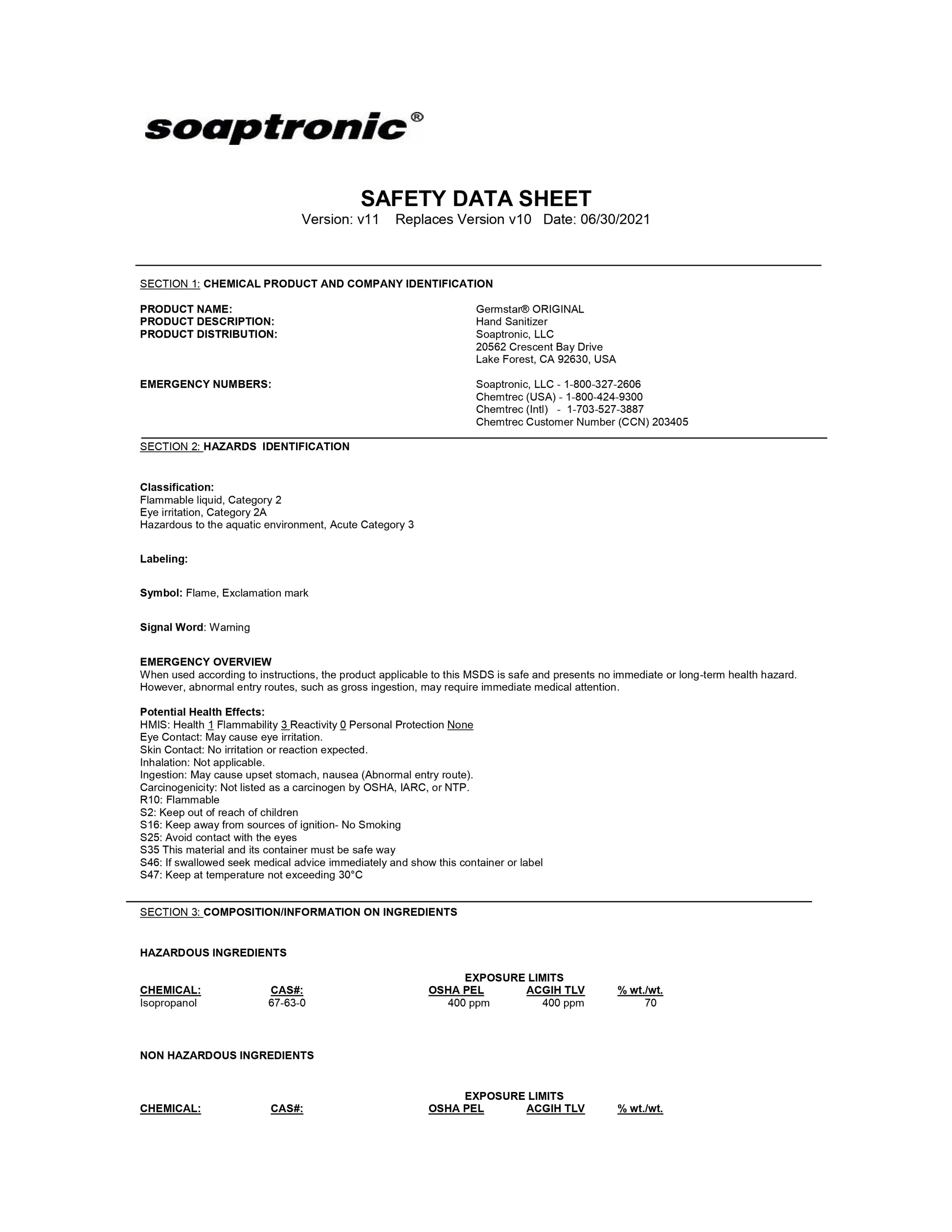 - Germstar ORIGINAL is free of triclosan, benzalkonium, chloride, phthalate, parabens, glycols, formaldehyde carriers, or most common allergens