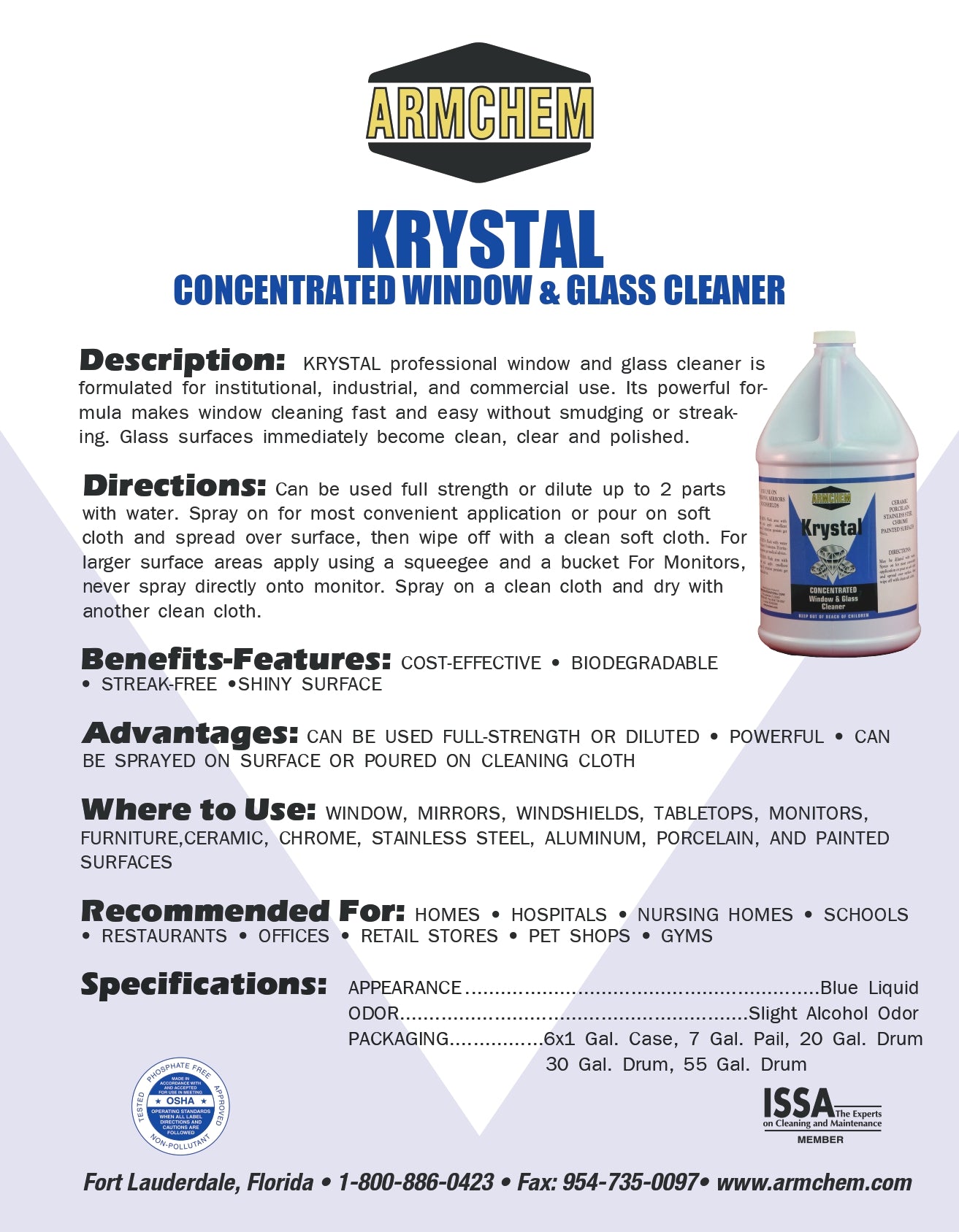KRYSTAL is a professional-grade window and glass cleaner designed for institutional, industrial, and commercial use. Its powerful formula ensures fast and easy cleaning without smudging or streaking, leaving glass surfaces clean, clear, and polished.