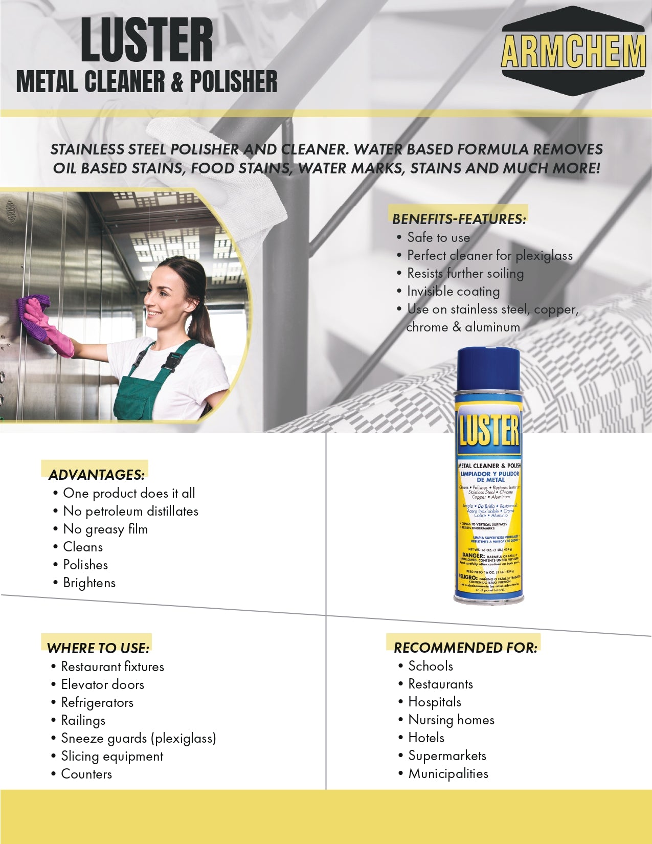 Restore brilliance to your metal surfaces with Luster, the all-in-one cleaner, polisher, and brightener. Designed for stainless steel and other metals, Luster effortlessly removes oil-based stains, watermarks, and food residue—leaving behind a flawless, streak-free finish without any greasy buildup.