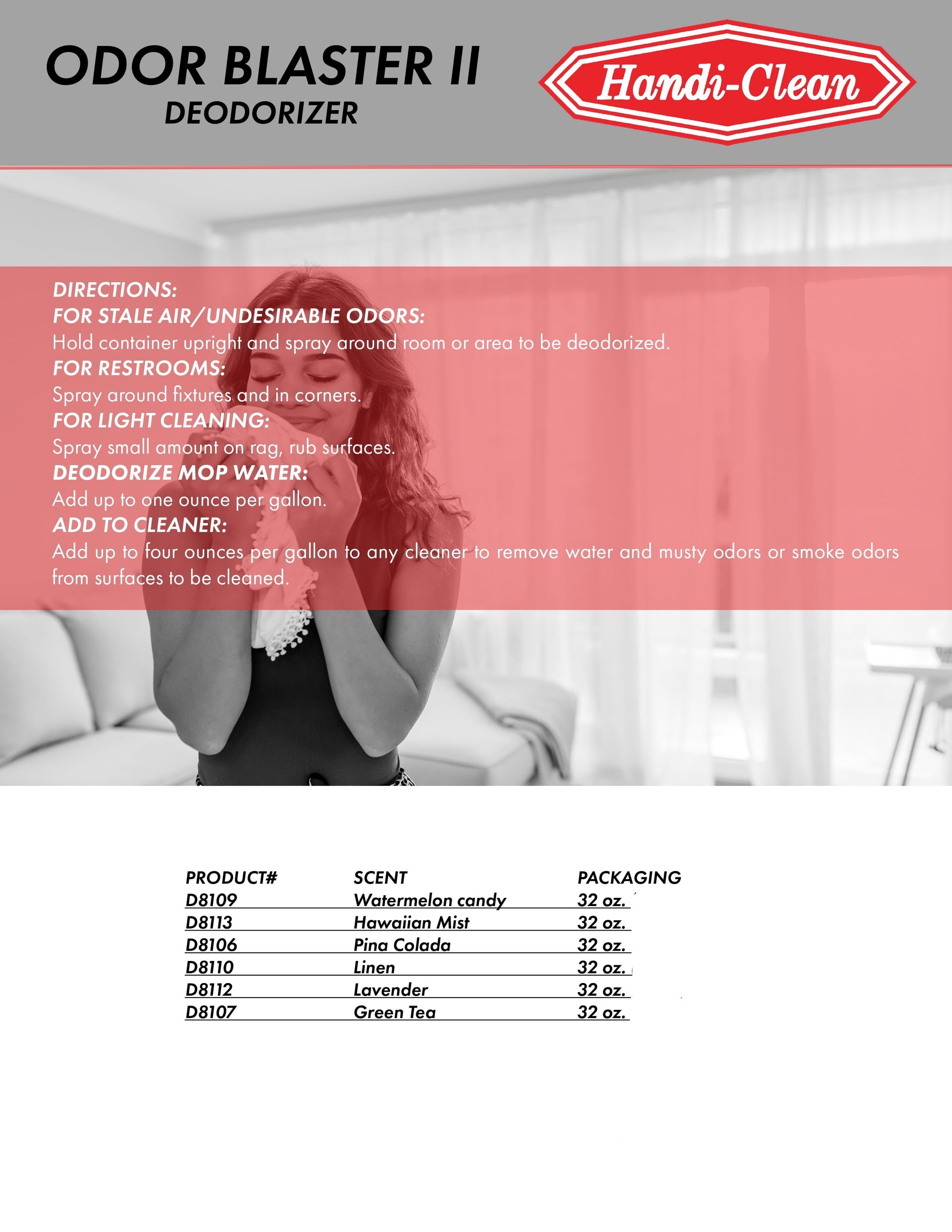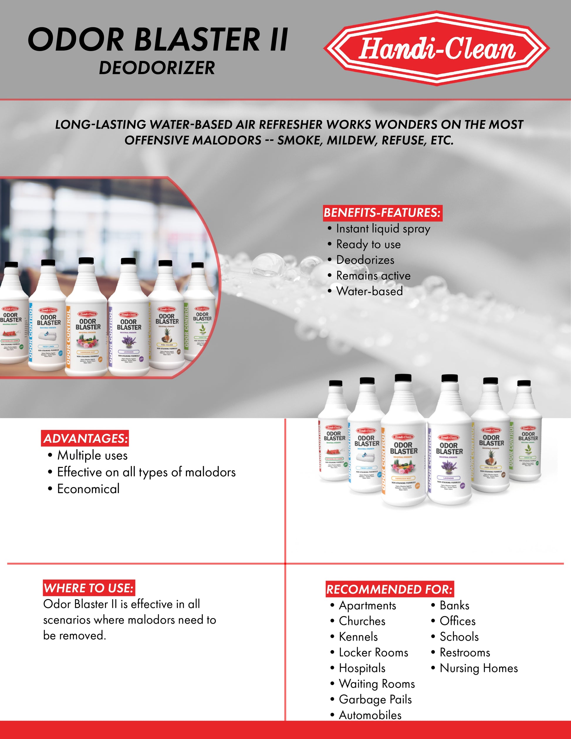 Odor Blaster II Deodorizer effectively eliminates all types of malodors, making it versatile and economical. This long-lasting, water-based air refresher works wonders on smoke, mildew, refuse, and other offensive odors. Perfect for use in apartments, banks, churches, offices, kennels, schools, locker rooms, restrooms, hospitals, nursing homes, waiting rooms, garbage pails, and automobiles.