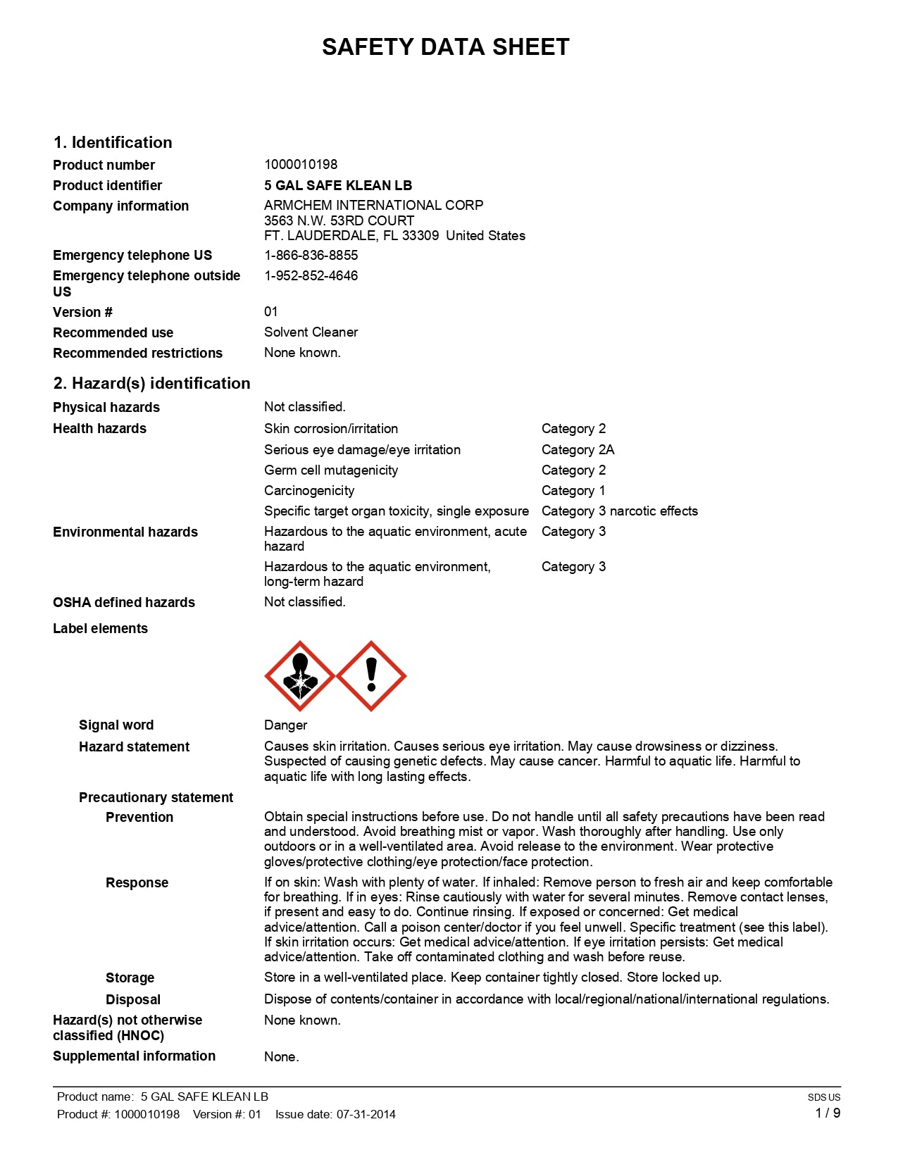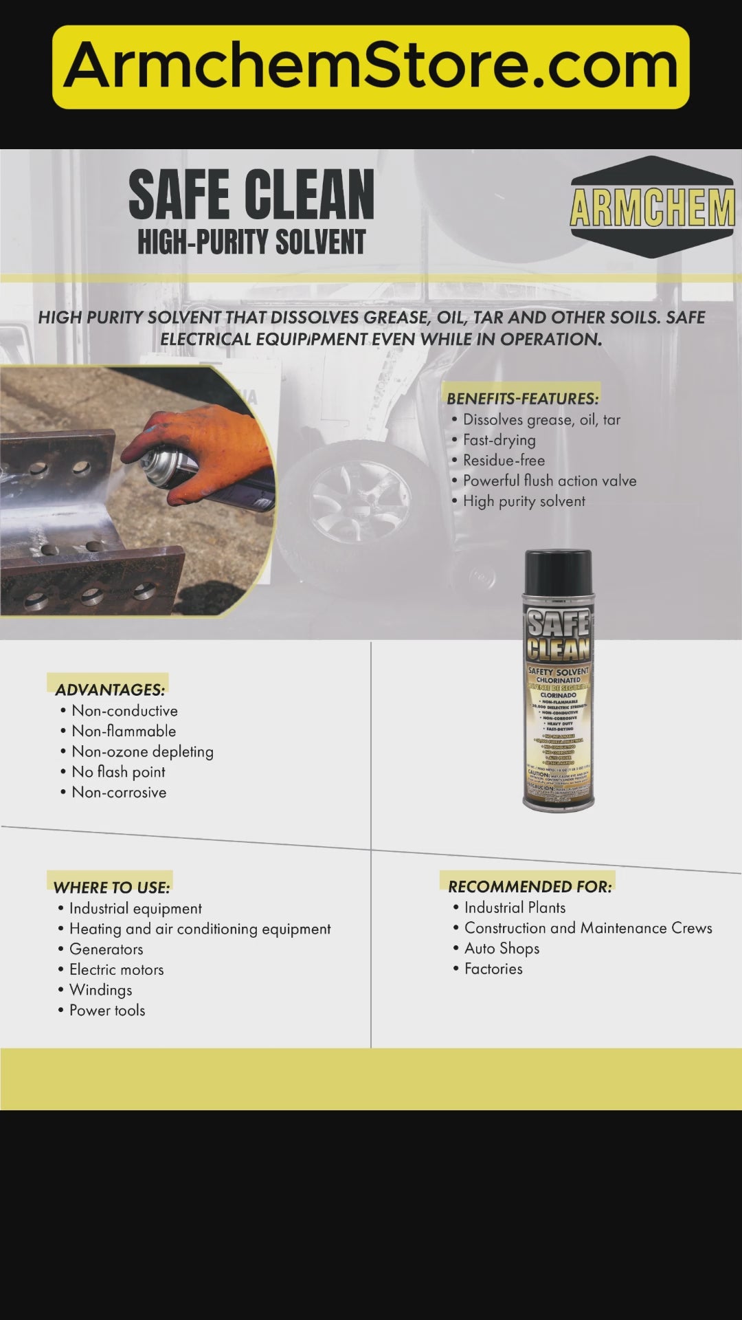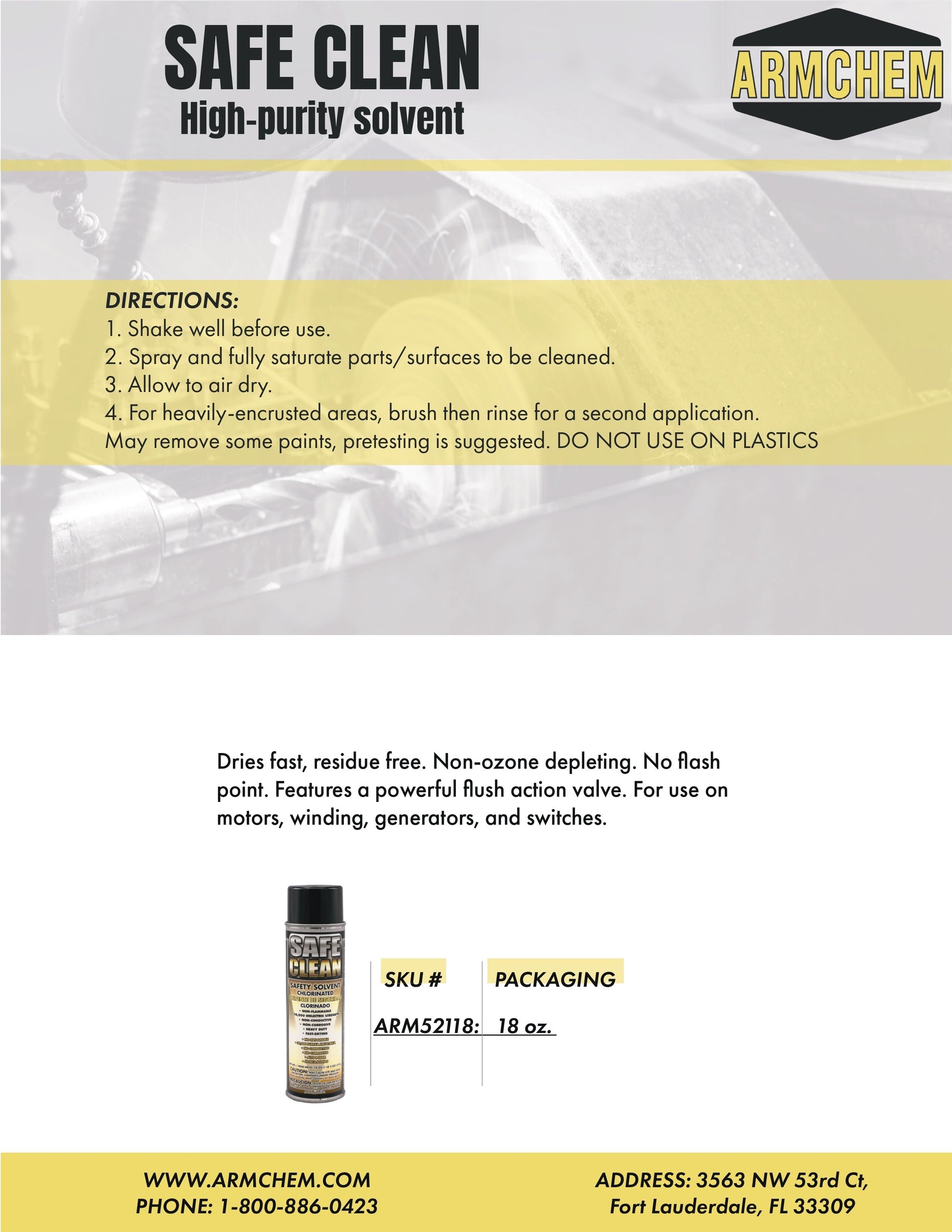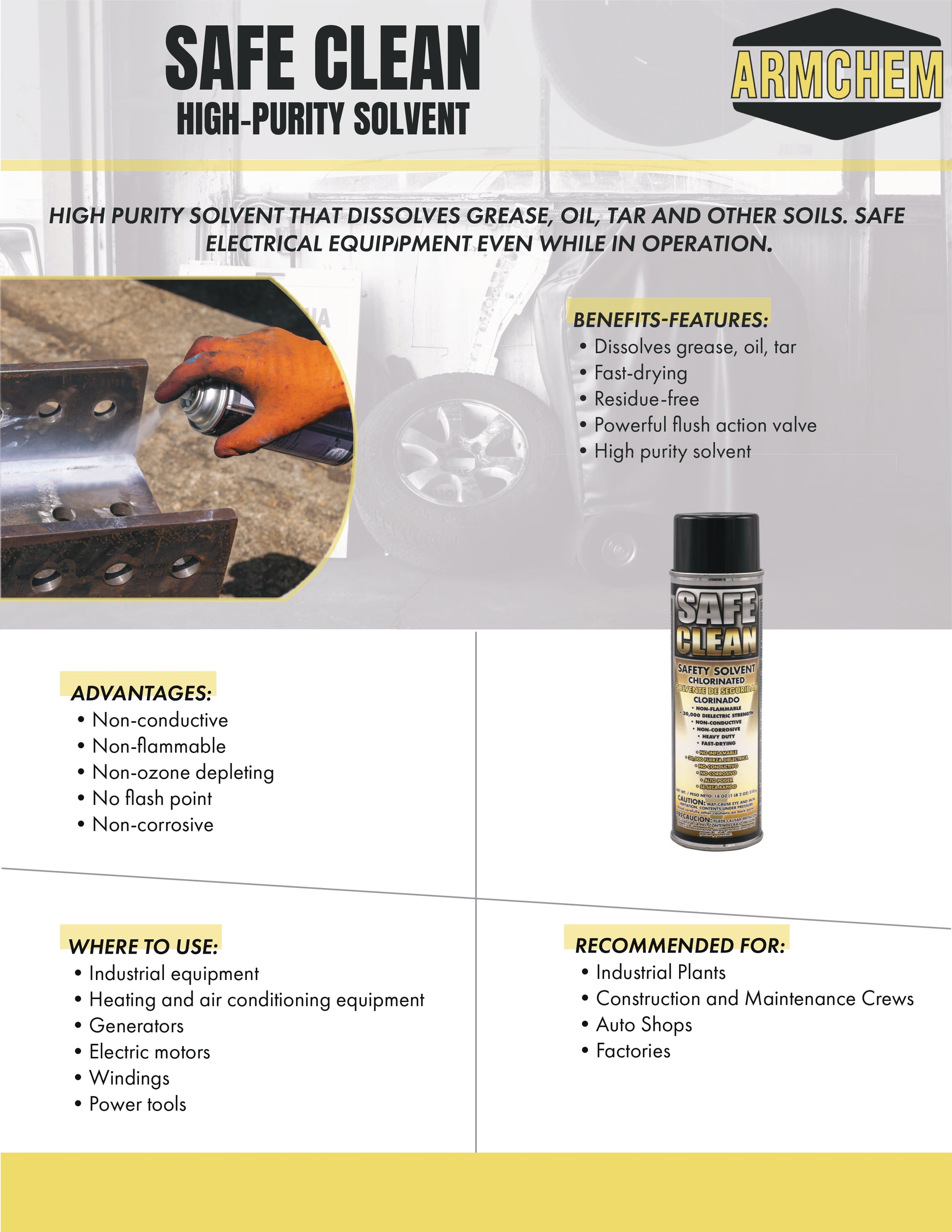Safe Clean is a non-flammable, non-conductive, high purity solvent that dissolves grease, oil, tar and other soils. It's safe on electrical equipment, even while in operation! Safe Clean dries quickly and is residue free.