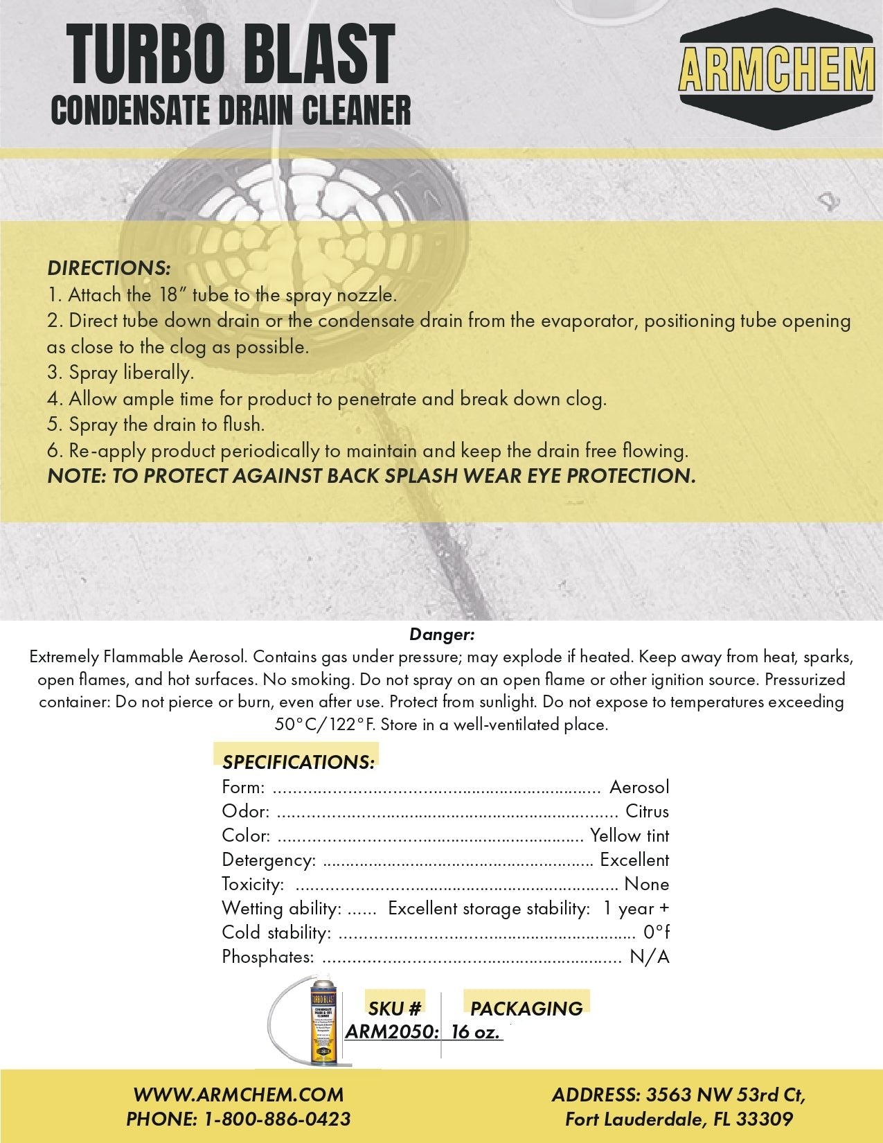 Description: Turbo Blast is a natural, citrus-based cleaner designed to clear clogged drains and condensate drain lines. This high-pressure spray connects to an 18” tube, allowing quick penetration directly to the source of the problem. Turbo Blast begins working immediately to flush out algae, slime, hair, and organic matter.